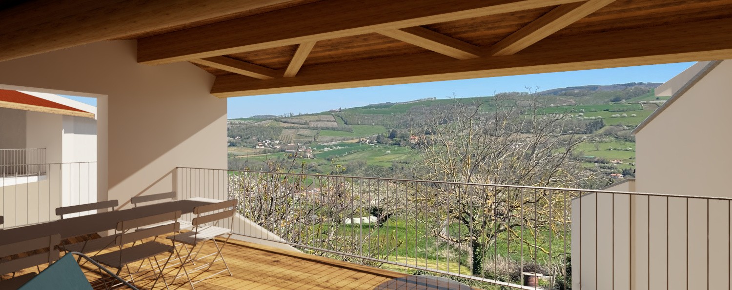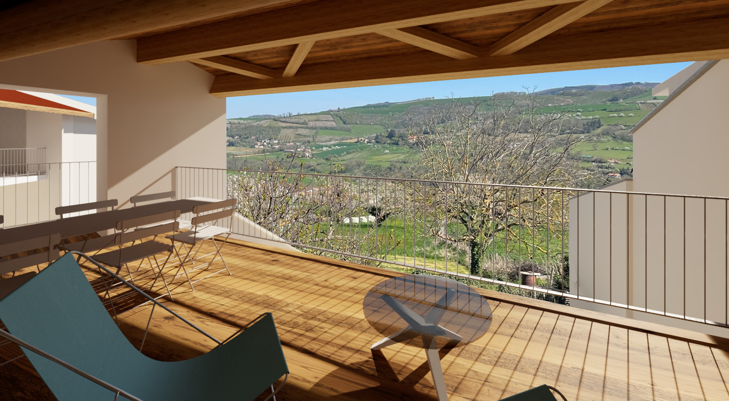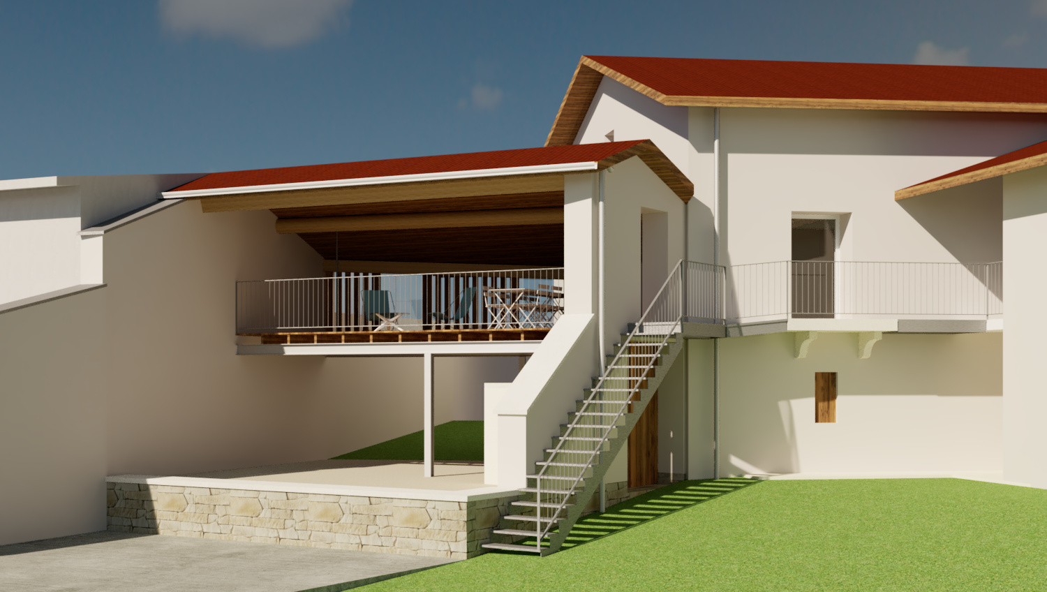 L’équipe d’A AU CARRE ARCHITECTE a proposé l’aménagement d’une terrasse couverte à l’étage d’une grange annexe afin d’offrir à la maison un espace extérieur contigu. La façade Est, largement ouverte par le projet, permet de profiter de la vue lointaine depuis la terrasse en bois et depuis le terrain de pétanque créé au rez-de-chaussée.
